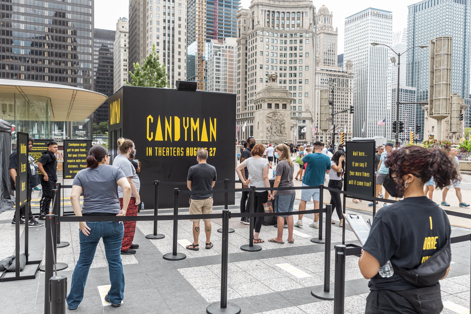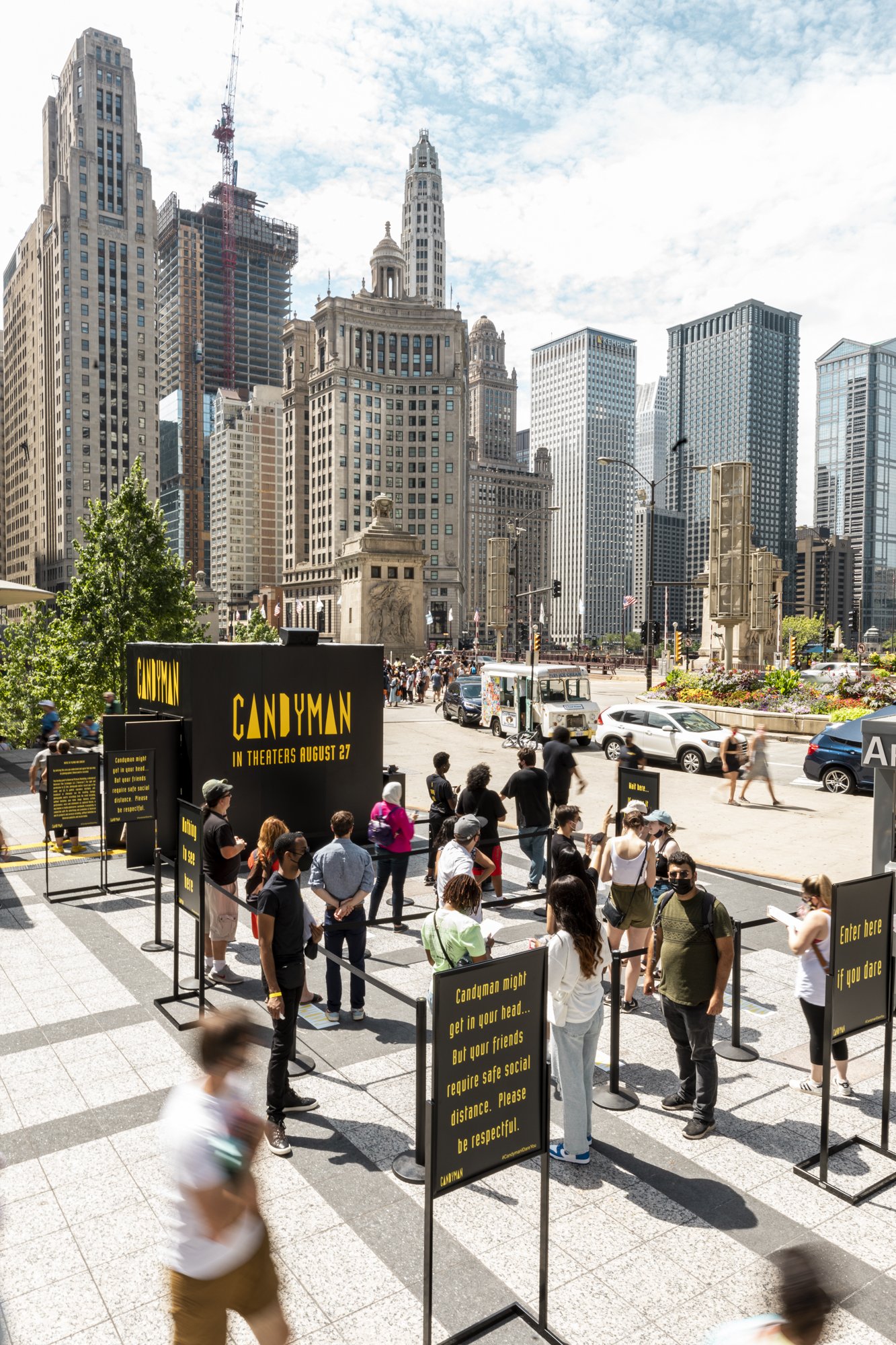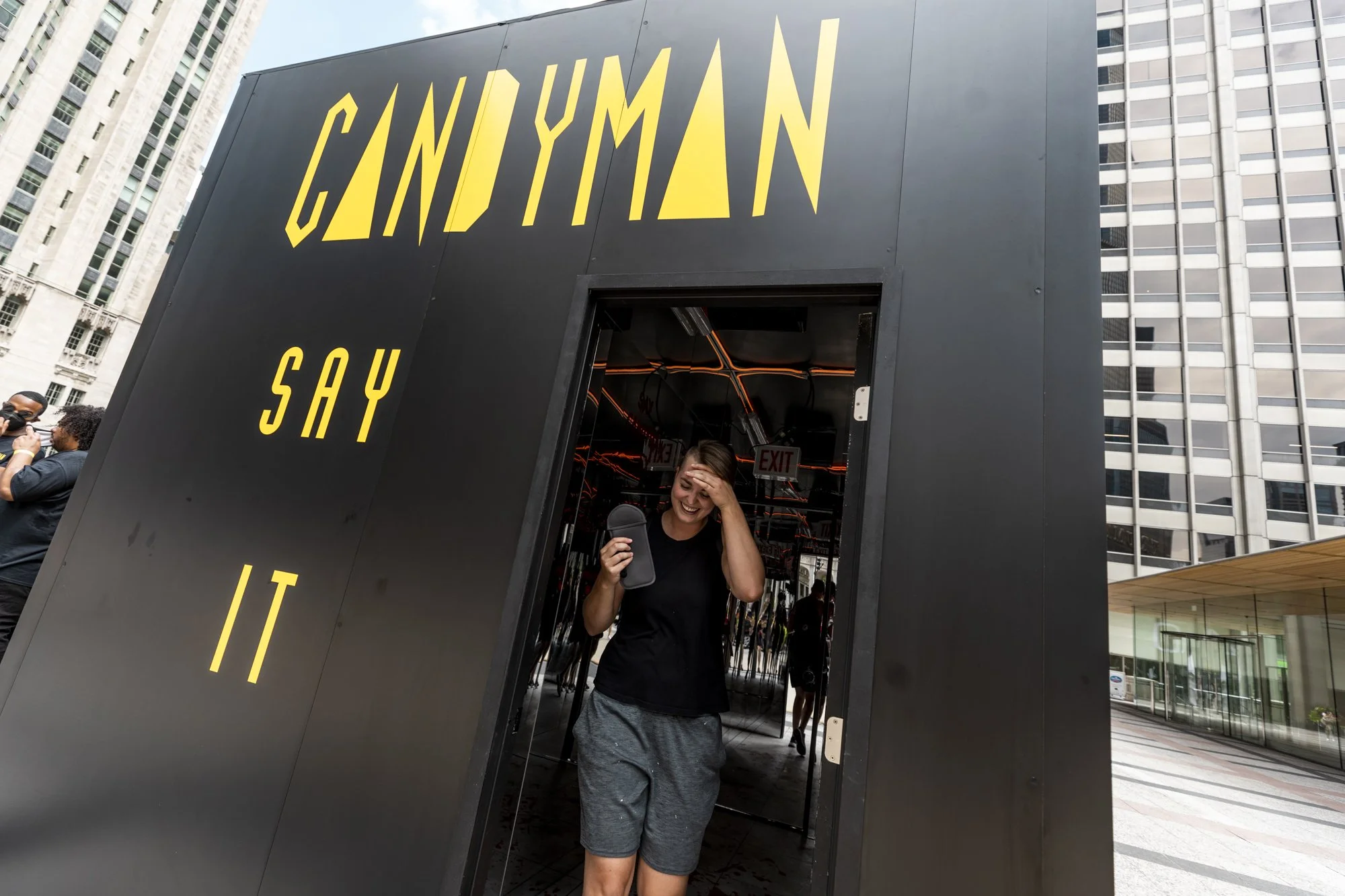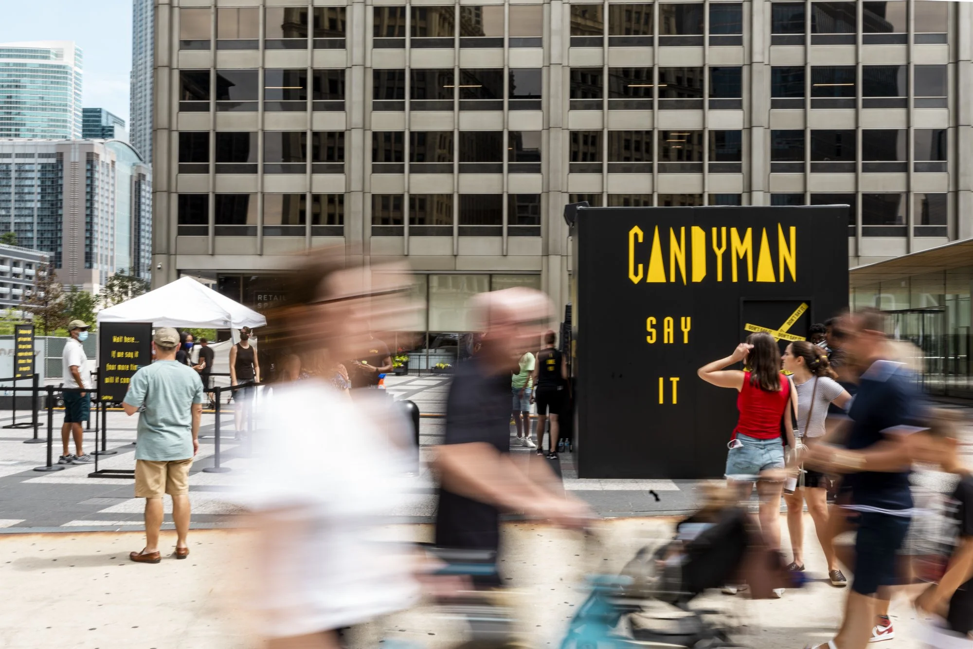 In August 2021, The Candyman Experience: Say It. I Dare You! transformed Chicago’s Pioneer Court into a haunting, immersive pop-up promoting the Universal Pictures and MGM film Candyman. The activation invited visitors to confront an eerie mirror installation where they could “say his name” five times, recreating the movie’s legendary summoning ritual. Designed as an interactive blend of suspense, culture, and storytelling, the experience featured atmospheric lighting, reflective surfaces, and ambient sound to pull guests into the film’s world. The installation drove heavy social engagement, with attendees sharing their mirror moments across platforms, turning a chilling urban legend into a viral, cinematic encounter that blurred the line between art, marketing, and myth.
